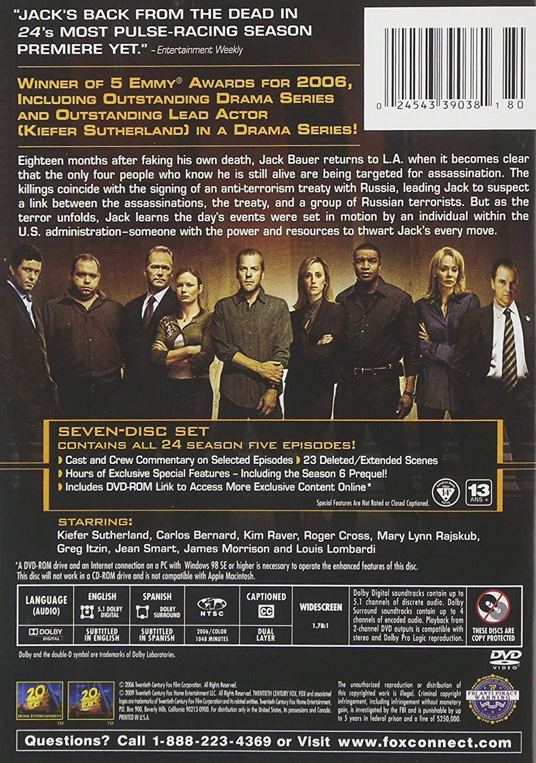 Cantidad de Discos: 7 | Lanzamiento: 2001 | Género(s): Serie de TV, Intriga, Acción, Thriller | Audio: Español (Dolby Digital 5,1), Inglés (Dolby Digital 5,1) | Subtítulos: Español, Inglés | Título: 24 – 5 Season | Director(es): Joel Surnow (Creator), Robert Cochran (Creator), Jon Cassar, Brad Turner, Milan Cheylov, Bryan Spicer, Stephen Hopkins, Ian Toynton, Frederick King Keller, James Whitmore Jr., Tim Iacofano, Kevin Hooks, Michael Klick, Rodney Charters, Joseph A. Hodges, Winrich Kolbe, Davis Guggenheim, Paul Shapiro, Ken Girotti, Dwight H. Little, Nelson McCormick | Reparto: Kiefer Sutherland, Elisha Cuthbert, Mary Lynn Rajskub, Dennis Haysbert, Carlos Bernard, James Morrison, Reiko Aylesworth, Jude Ciccolella, Kim Raver, Cherry Jones, Leslie Hope, Sarah Clarke, Gregory Itzin, Glenn Morshower, D.B. Woodside, Roger R. Cross, Penny Johnson, Bob Gunton, Katee Sackhoff, Zachary Quinto, Eric Balfour, Peter MacNicol, James Badge Dale, Freddie Prinze Jr., Janeane Garo
