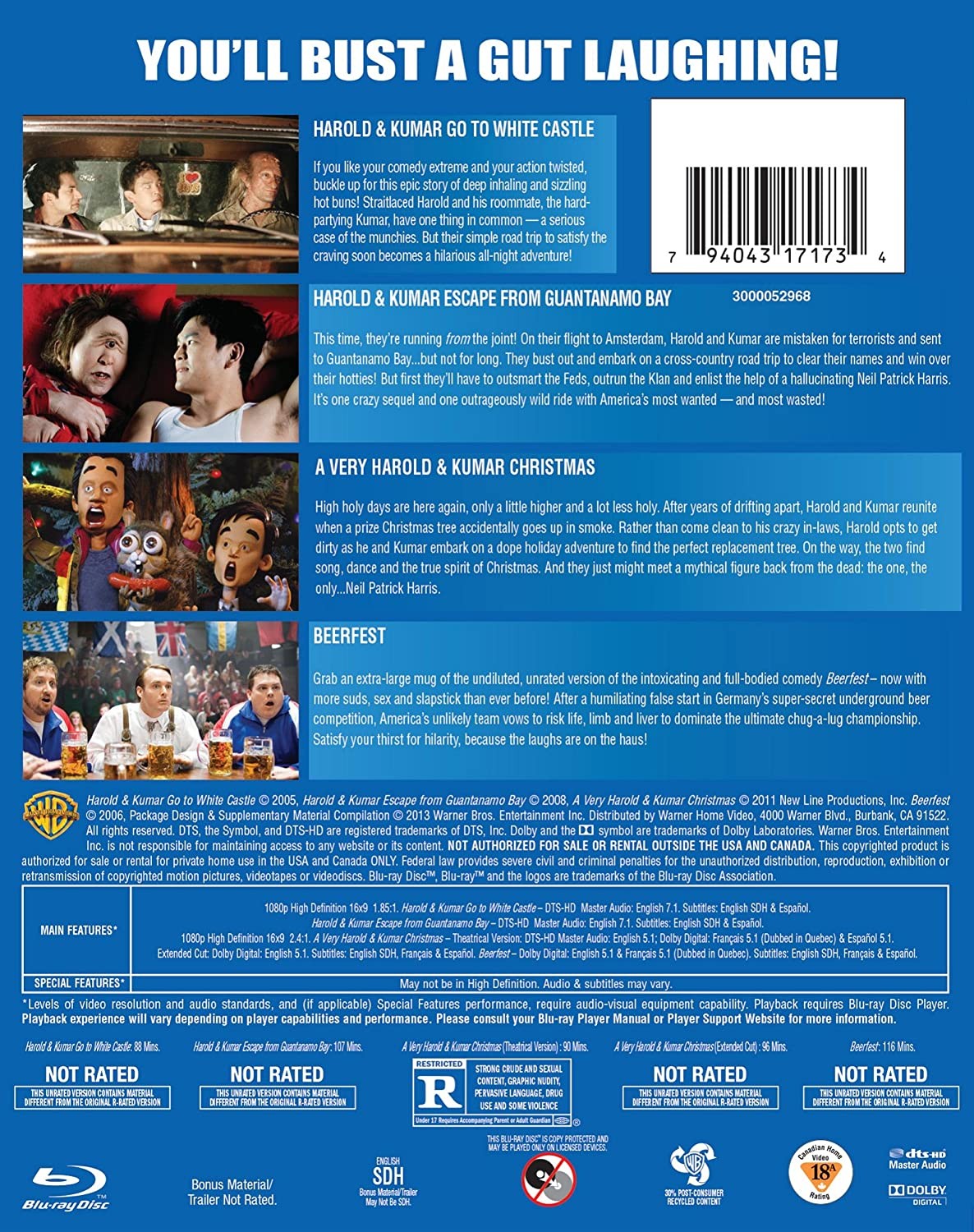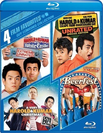 Cantidad de Discos: 4 | Lanzamiento: 2014 | Género(s): Comedia. | Audio: Español, Inglés, Francés | Subtítulos: Español, Inglés, Francés | Título: Harold & Kumar (2004) / Harold & Kumar 2 (2008) / La Navidad de Harold y Kumar (2011) / Beerfest (2006) | Director(es): Danny Leiner / Jon Hurwitz, Hayden Schlossberg / Todd Strauss-Schulson / Jay Chandrasekhar | Reparto: John Cho, Kal Penn, Neil Patrick Harris, Sandy Jobin-Bevans, Fred Willard, Eddie Kaye Thomas, Paula Garces, Christopher Meloni, David Krumholtz, Jamie Kennedy, Ryan Reynolds, Malin Akerman /