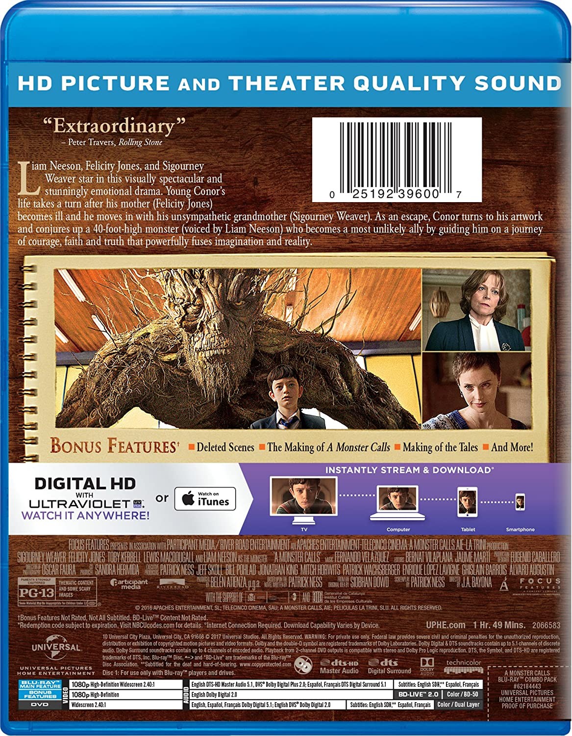 Tras la separación de sus padres, Connor (Lewis MacDougall), un chico de 12 años, tendrá que ocuparse de llevar las riendas de la casa, pues su madre (Felicity Jones) está enferma de cáncer. Así las cosas, el niño intentará superar sus miedos y fobias con la ayuda de un monstruo (Liam Neeson), pero sus fantasías tendrán que enfrentarse no sólo con la realidad, sino con su fría y calculadora abuela (Sigourney Weaver). Con este nuevo trabajo J.A. Bayona cierra su trilogía sobre las relaciones maternofiliales, que inició con «El orfanato» y continuó con «Lo imposible».