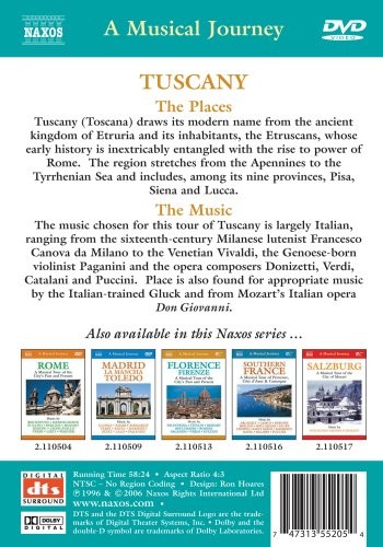 Cantidad de Discos: 1 | Lanzamiento: 2006 | Género(s): Serie de TV, Documental | Audio: Inglés (Dolby Digital Stereo) | TÃtulo: Naxos Scenic Musical Journeys Tuscany A Musical Tour of the Region’s Past and Present | Director(es): Adriano | Norma / Región: Multizona | Cantidad de Discos: 1 | Lanzamiento: 2006 | Género(s): Serie de TV, Documental | Audio: Inglés (Dolby Digital Stereo) | TÃtulo: Naxos Scenic Musical Journeys Tuscany A Musical Tour of the Region’s Past and Present | Director(es): Adriano | Norma / Región: Multizona