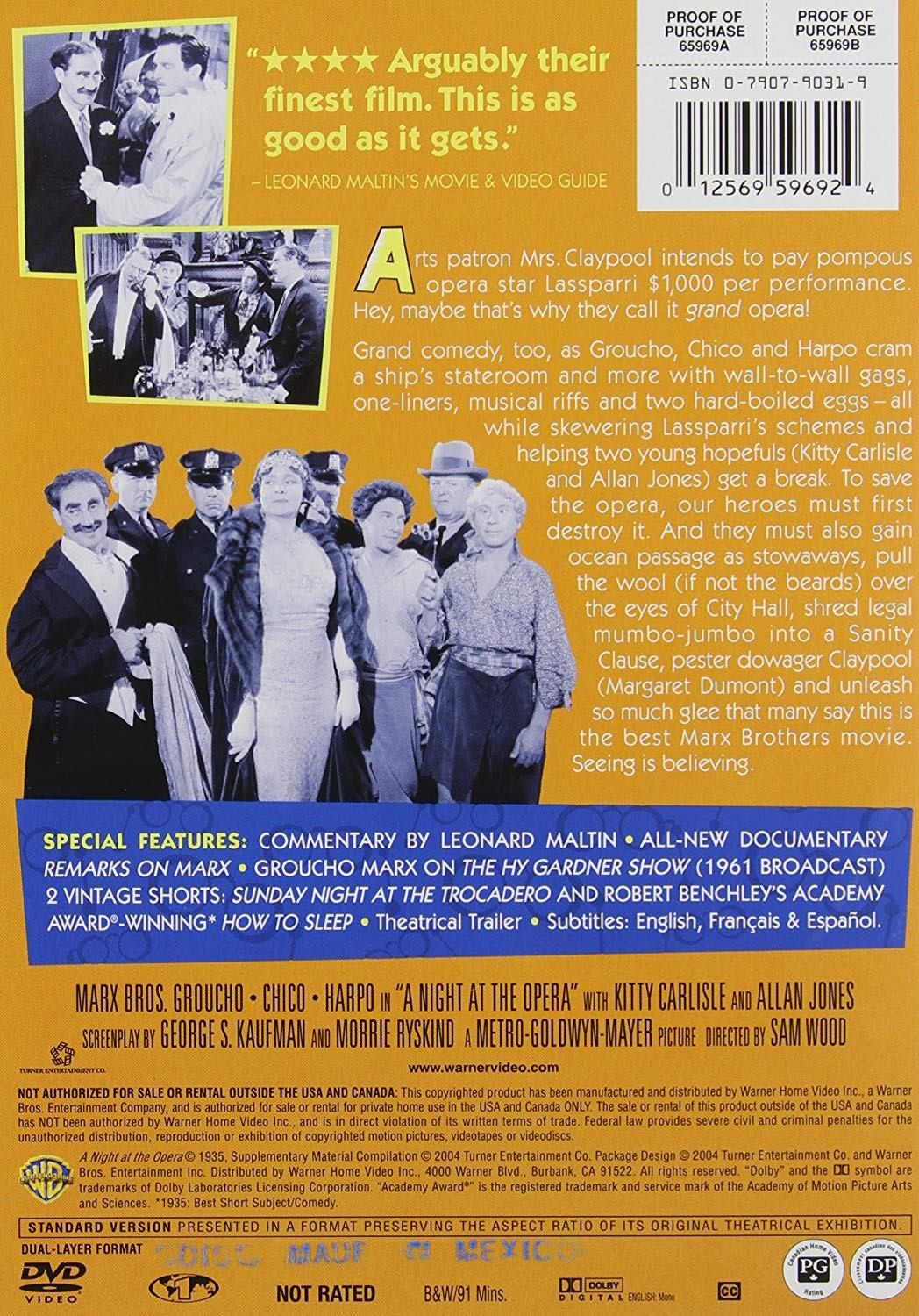Cantidad de Discos: 1 | Lanzamiento: 2005 | Género(s): Comedia, Ópera | Audio: Inglés (Dolby Digital 2.1) | SubtÃtulos: Español, Inglés, Francés | TÃtulo: Una noche en la ópera (1935) | Director(es): Sam Wood | Reparto: The Marx Brothers, Groucho Marx, Harpo Marx, Chico Marx, Margaret Dumont, Kitty Carlisle, Allan Jones, Sig Ruman, Walter Woolf King, Edward Keane, Robert Emmett O’Connor, Lorraine Bridges | Norma / Región: NTSC 1 | Cantidad de Discos: 1 | Lanzamiento: 2005 | Género(s): Comedia, Ópera | Audio: Inglés (Dolby Digital 2.1) | SubtÃtulos: Español, Inglés, Francés | TÃtulo: Una noche en la ópera (1935) | Director(es): Sam Wood | Reparto: The Marx Brothers, Groucho Marx, Harpo Marx, Chico Marx, Margaret Dumont, Kitty Carlisle, Allan Jones, Sig Ruman, Walter Woolf King, Edward Keane, Robert Emmett O’Connor, Lorraine Bridges | Norma / Región: NTSC 1