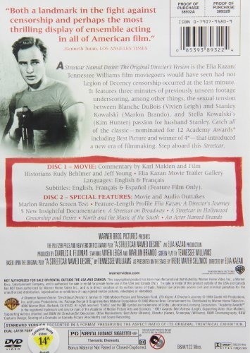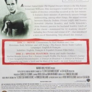 Una selección ejemplar de material de apoyo hace que este segundo disco sea mucho más que un lanzamiento. El perfil lúcido de 90 minutos de Richard Schickel, Elia Kazan: A Director's Journey, da cuenta de la carrera de Kazan, incluidas pelÃculas menos conocidas pero dignas como Wild River y America, America. (Sin embargo, uno se pregunta por qué un documental sobre el arte de un director no puede poner buzón en sus clips de pantalla panorámica.) El trabajo de Kazan, en lugar de su vida fascinante, es el enfoque y su testimonio de cooperación ante el Comité de Actividades Antiamericanas de la Cámara de Representantes en La década de 1950 recibe un tratamiento breve y neutral. Los clips de esas entrevistas de Kazan figuran en dos documentos más cortos, una mirada a los orÃgenes del tranvÃa en Broadway (y la forma en que la actuación de Marlon Brando amenazaba con inclinar la balanza de la obra) y una historia completa de media hora de adaptación de la pelÃcula. Un perfil de nueve minutos de Brando es principalmente una excusa para los recuerdos de Karl Malden, pero son recuerdos maravillosos. (Malden también contribuye con sus agudos recuerdos y sus sabios conocimientos a una pista de comentarios de la pelÃcula, junto con los guionistas Rudy Behlmer y Jeff Young, todos grabados por separado). Una mirada de diez minutos a la contribución del compositor Alex North es informativa e inteligente. Outtakes aquà son realmente una colección de fragmentos, de interés para los fanáticos. Una prueba de pantalla de Brando es sorprendentemente común, aunque uno puede ver indicios del tigre esperando para escapar. --Robert Horton