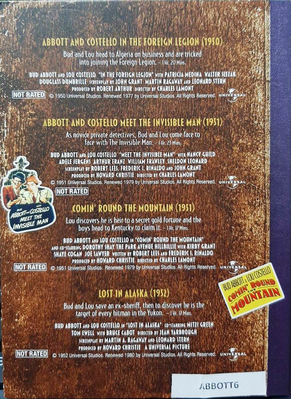 Cantidad de Discos: 2 | Lanzamiento: 2010 | Género(s): Comedia. Musical. Aventuras. Fantástico. Parodia | Audio: Inglés (Dolby Digital Mono) | SubtÃtulos: Español, Inglés, Francés | TÃtulo: Abbott y Costello en la Legión Extranjera (1950) / Abbott y Costello conocen al hombre invisible (1951) / Viniendo alrededor de la montaña (1951) | Director(es): Charles Lamont | Reparto: Bud Abbott, Lou Costello, Patricia Medina, Walter Slezak, Douglass Dumbrille, Leon Belasco, Marc Lawrence, William ‘Wee Willie’ Davis, Tor Johnson, Sammy Menacker, Jeff Chandler /