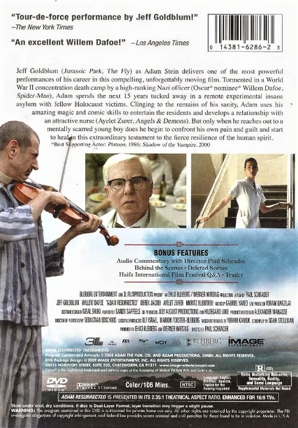 | Norma / Región: NTSC (Región 1) | Cantidad de Discos: 1 | Lanzamiento: 2008 | Género(s): Drama, Bélico | TÃtulo: Adam Resurrected (Adam, memorias de una guerra) | Director(es): Paul Schrader | Reparto: Jeff Goldblum, Willem Dafoe, Vasile Albinet, Idan Alterman, Moritz Bleibtreu, Veronica Ferres, Derek Jacobi, Dror Keren, Juliane Köhler, Ayelet Zurer, Hanna Laslo, Joachim Król, Evgenia Dodina, Gabriel Spahiu, Theodor Danetti, Coca Bloos, Ioana Abur