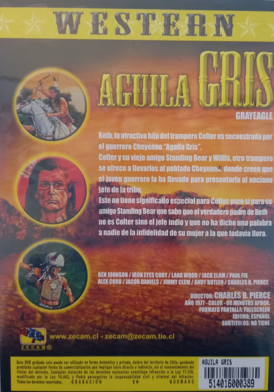 | Reparto: Ben Johnson, Iron Eyes Cody, Lana Wood, Jack Elam, Cindy Butler, Paul Fix, John Welsh, Alex Cord, Jimmy Clem | Norma / Región: NTSC4 | Cantidad de Discos: 1 | Lanzamiento: 2010 | Audio: Español | TÃtulo: Grayeagle (1977) | Director(es): Charles B. Pierce