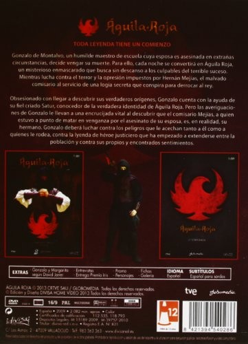 Serie de TV (2009-2016). 9 temporadas. 116 episodios. La acción se sitúa el Siglo de Oro, durante el reinado de Felipe IV (1621-1665). Buscando al culpable de la muerte de su mujer, Gonzalo de Montalvo (David Janer), maestro de profesión, se verá envuelto en diversas aventuras e intrigas placiegas, que lo obligarán a llevar una doble vida y se convertirá en un misterioso héroe justiciero, conocido como «Águila roja». Fiel a su código moral regido por el valor, la nobleza, la amistad y el amor, se dedica a ayudar a los débiles al tiempo que trata de descubrir la conspiración que se esconde tras el asesinato de su esposa y cuyo objetivo es derrocar al Rey. Nadie, excepto su fiel criado Sátur y un misterioso fraile, conoce la verdadera identidad de Águila Roja, ni siquiera su único hijo, que siente una profunda admiración por el misterioso personaje, ajeno por completo al hecho de que viven bajo el mismo techo.