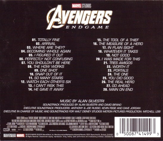 Artista(s) / Grupo: Alan Silvestri | Cantidad de Discos: 1 | Lanzamiento: 2019 | Género(s): Soundtrack | TÃtulo: Avengers: Endgame (Original Motion Picture Soundtrack) | Artista(s) / Grupo: Alan Silvestri | Cantidad de Discos: 1 | Lanzamiento: 2019 | Género(s): Soundtrack | TÃtulo: Avengers: Endgame (Original Motion Picture Soundtrack)
