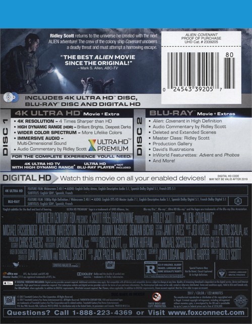 Lanzamiento: 2017 | Género(s): Terror | Audio: Español (Dolby Digital 5.1), Francés (DTS 5.1), Inglés (DTS-HD MA 5.1), Inglés (DTS-HD MA 7.1), Inglés (DTS-HD MA TrueHD) | SubtÃtulos: Inglés, Español, Francés | TÃtulo: Alien – Covenant (4k Ultra HD + Blu-ray + UltraViolet) | Director(es): Ridley Scott | Reparto: Michael Fassbender, Katherine Waterston, Billy Crudup, Demian Bichir, Danny McBride, Carmen Ejogo, Jussie Smollett, Amy Seimetz, Callie Hernandez, Benjamin Rigby, Alexander England, Uli Latukefu, Tess Haubrich, Guy Pearce, Noomi Rapace, James Franco | Sub-CategorÃas: Ciencia Ficción | Norma / Región: NTSC (Región A) | Lanzamiento: 2017 | Género(s): Terror | Audio: Español (Dolby Digital 5.1), Francés (DTS 5.1), Inglés (DTS-HD MA 5.1), Inglés (DTS-HD MA 7.1), Inglés (DTS-HD MA TrueHD) | SubtÃtulos: Inglés, Español, Francés | TÃtulo: Alien – Covenant (4k Ultra HD + Blu-ray + UltraViolet) | Director(es): Ridley Scott | Reparto: Michael Fassbender, Katherine Waterston, Billy Cru