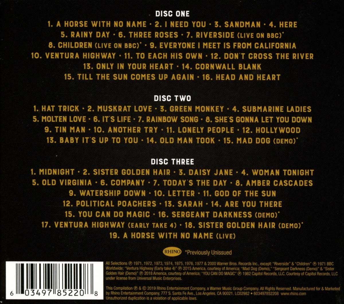Artista(s) / Grupo: America | Cantidad de Discos: 3 CD | Lanzamiento: 2019 | Género(s): Rock, Pop, Folk, World, & Country | Estilo(s): Rock, Pop, Folk, World, & Country | TÃtulo: 50th Anniversary – The Collection | Artista(s) / Grupo: America | Cantidad de Discos: 3 CD | Lanzamiento: 2019 | Género(s): Rock, Pop, Folk, World, & Country | Estilo(s): Rock, Pop, Folk, World, & Country | TÃtulo: 50th Anniversary – The Collection