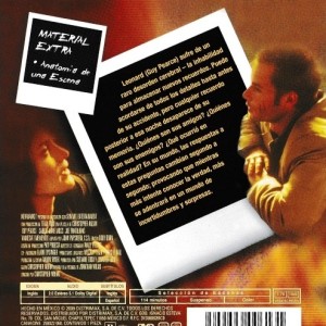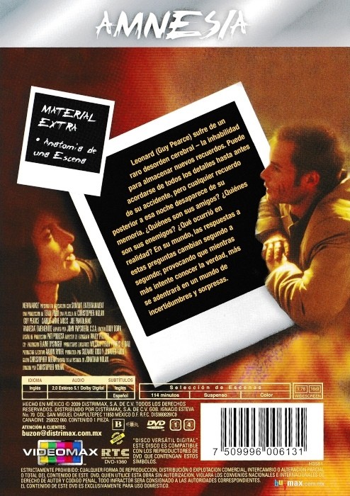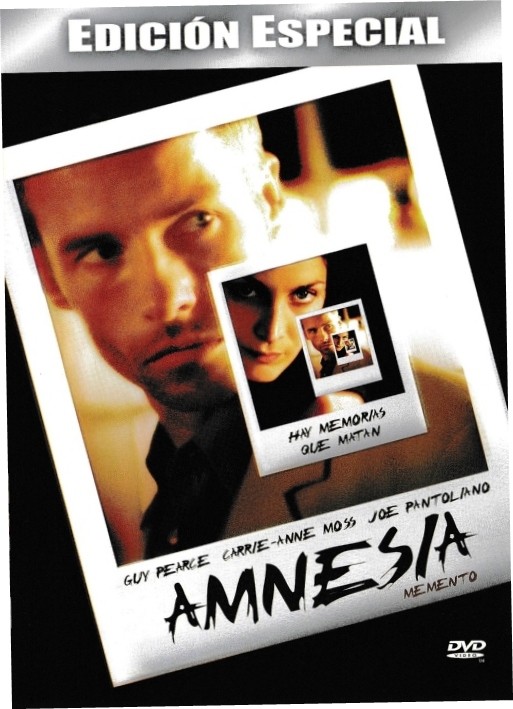 Cantidad de Discos: 1 | Lanzamiento: 2000 | Género(s): Intriga, Drama, Terror | Audio: Inglés | SubtÃtulos: Español, Inglés | TÃtulo: Amnesia – Memento | Director(es): Christopher Nolan | Reparto: Guy Pearce, Carrie-Anne Moss, Joe Pantoliano, Mark Boone Junior, Stephen Tobolowsky, Harriet Sansom Harris, Jorja Fox | Sub-CategorÃas: Acción | Norma / Región: NTSC (Región 1, 4) | Cantidad de Discos: 1 | Lanzamiento: 2000 | Género(s): Intriga, Drama, Terror | Audio: Inglés | SubtÃtulos: Español, Inglés | TÃtulo: Amnesia – Memento | Director(es): Christopher Nolan | Reparto: Guy Pearce, Carrie-Anne Moss, Joe Pantoliano, Mark Boone Junior, Stephen Tobolowsky, Harriet Sansom Harris, Jorja Fox | Sub-CategorÃas: Acción | Norma / Región: NTSC (Región 1, 4)