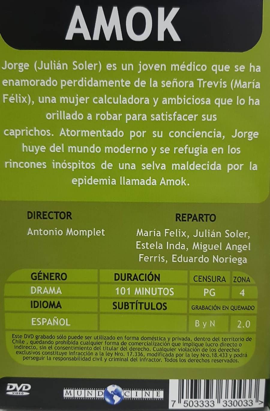 | Norma / Región: Multizona ( Disco Quemado ) | Cantidad de Discos: 1 | Lanzamiento: 2010 | Género(s): Drama | Audio: Español | Título: Amok (1944) | Director(es): Antonio Momplet | Reparto: María Félix, Julián Soler, Estela Inda, Miguel Ángel Ferriz, José Baviera, Miguel Arenas