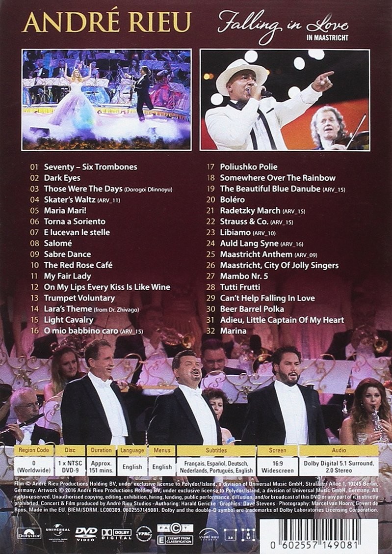 Artista(s) / Grupo: Andrè Rieu | Cantidad de Discos: 1 | Lanzamiento: 2016 | Género(s): MusicaClasica | Estilo(s): Clasica, Opera, Ballet | Audio: Inglés | SubtÃtulos: Francés, Portugués, Español, Inglés | TÃtulo: Falling in Love in Maastricht | Sub-CategorÃas: Musica Clasica | Norma / Región: 1 | Artista(s) / Grupo: Andrè Rieu | Cantidad de Discos: 1 | Lanzamiento: 2016 | Género(s): MusicaClasica | Estilo(s): Clasica, Opera, Ballet | Audio: Inglés | SubtÃtulos: Francés, Portugués, Español, Inglés | TÃtulo: Falling in Love in Maastricht | Sub-CategorÃas: Musica Clasica | Norma / Región: 1