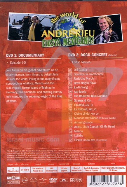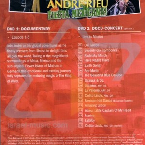 Artista(s) / Grupo: André Rieu | Cantidad de Discos: 2 | Lanzamiento: 2011 | Género(s): Clásica | Estilo(s): Opera, Ballet | Audio: Holandés | SubtÃtulos: Francés, Español, Inglés, Holandés | TÃtulo: Fiesta Mexicana | Norma / Región: Multizona | Artista(s) / Grupo: André Rieu | Cantidad de Discos: 2 | Lanzamiento: 2011 | Género(s): Clásica | Estilo(s): Opera, Ballet | Audio: Holandés | SubtÃtulos: Francés, Español, Inglés, Holandés | TÃtulo: Fiesta Mexicana | Norma / Región: Multizona