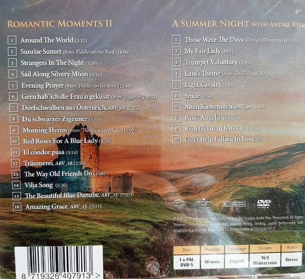 Artista(s) / Grupo: André Rieu | Cantidad de Discos: 1 DVD + 1 CD | Lanzamiento: 2018 | Género(s): Classical | Audio: Inglés (Dolby Digital Stereo) | TÃtulo: Romantic Moments II | Norma / Región: PAL Multizona | Artista(s) / Grupo: André Rieu | Cantidad de Discos: 1 DVD + 1 CD | Lanzamiento: 2018 | Género(s): Classical | Audio: Inglés (Dolby Digital Stereo) | TÃtulo: Romantic Moments II | Norma / Región: PAL Multizona