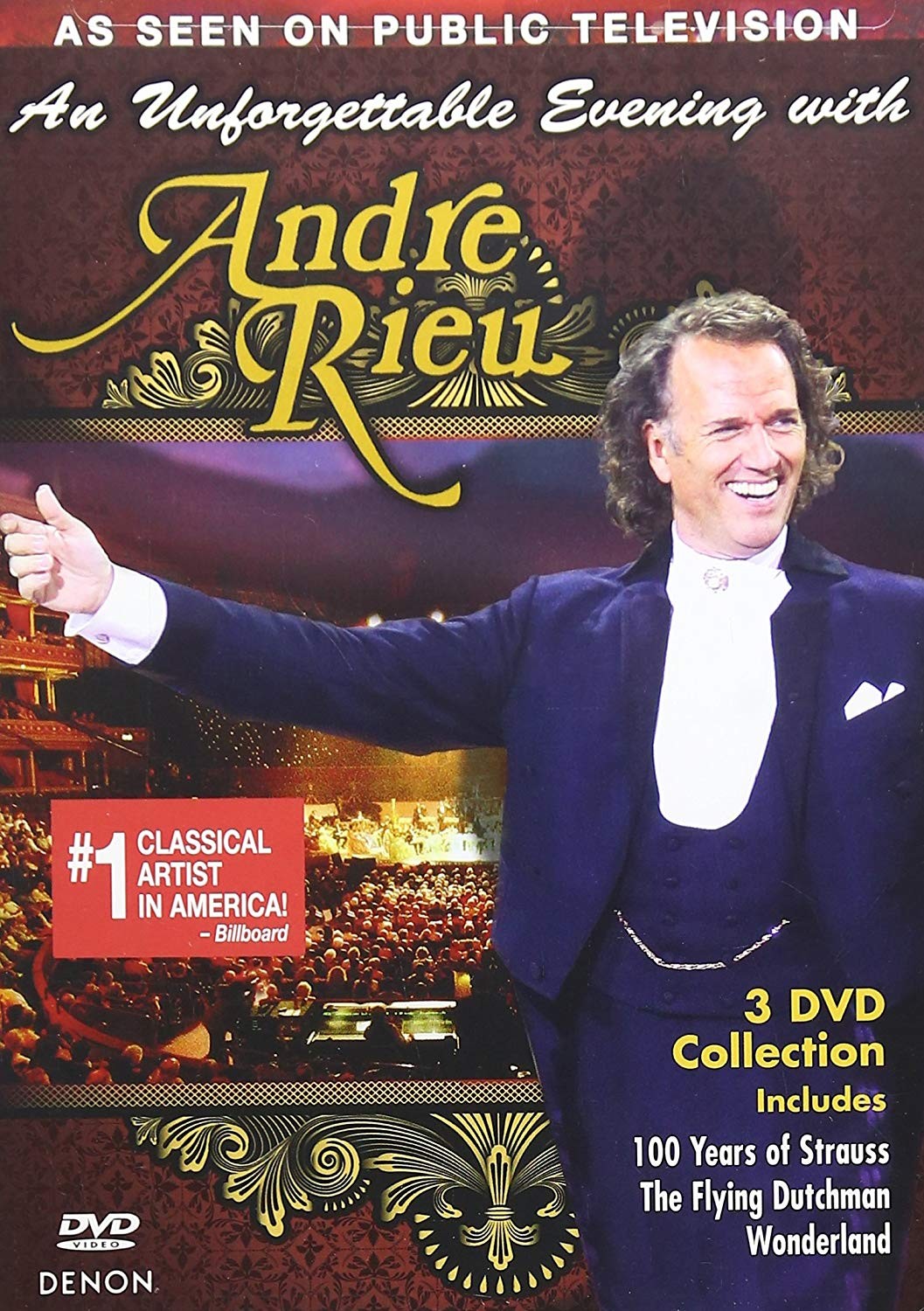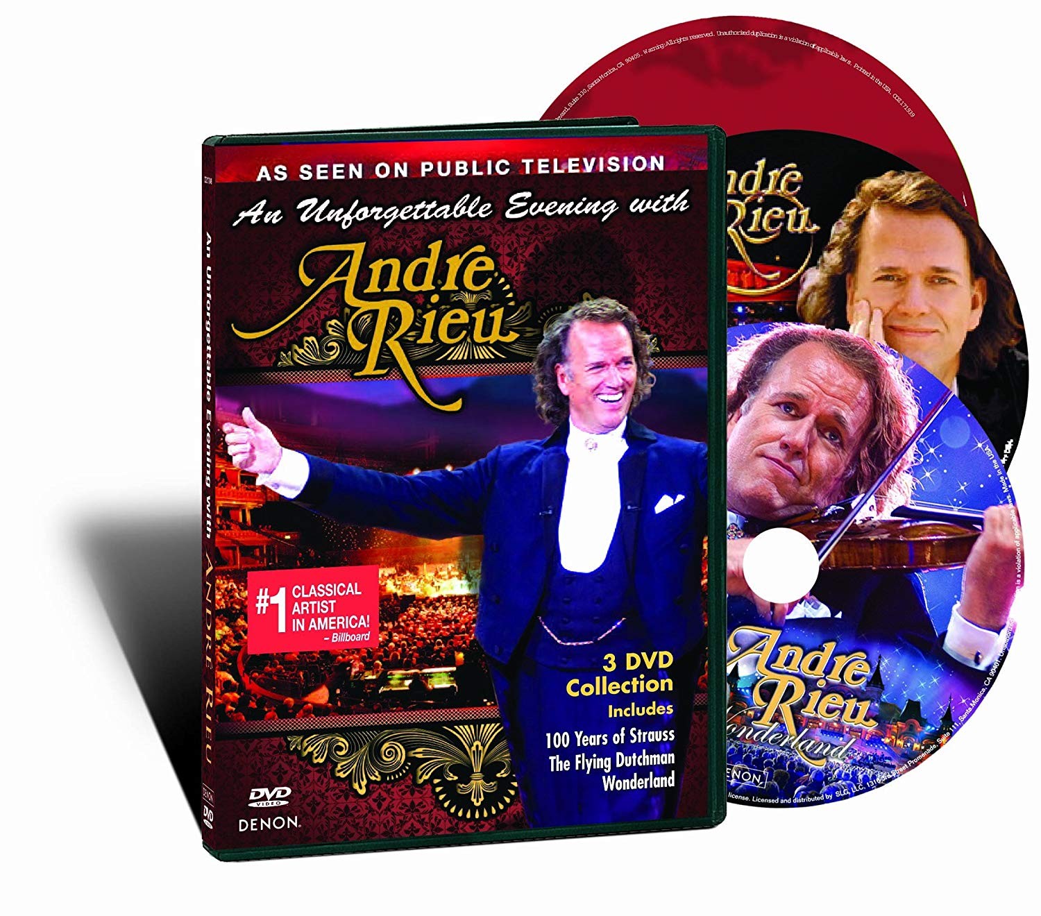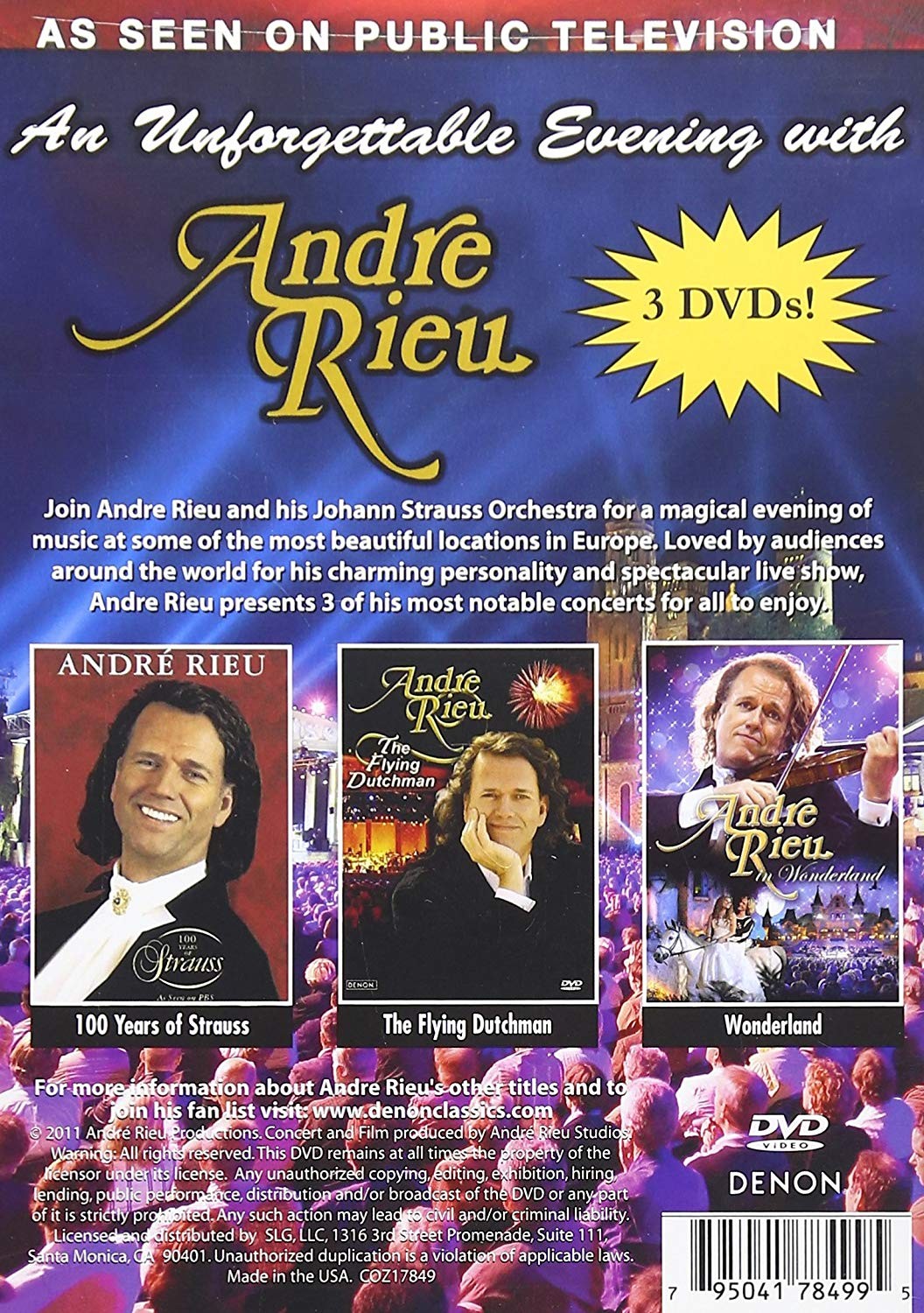 Únete a Andre Rieu y su orquesta Johann Strauss en una mágica noche de música en algunos de los lugares más hermosos de Europa. Amado por el público de todo el mundo por su encantadora personalidad y espectacular show en vivo, Andre Rieu presenta 3 de sus conciertos más destacados para que todos disfruten. Incluido en este paquete de lujo: 100 años de Strauss, The Flying Dutchman y Wonderland.
