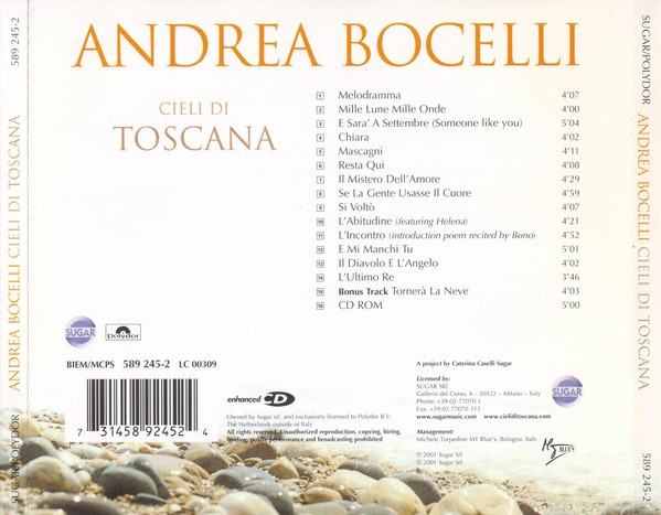 Artista(s) / Grupo: Andrea Bocelli | Cantidad de Discos: 1 | Lanzamiento: 2001 | Género(s): Pop | Estilo(s): Vocal | TÃtulo: Cieli Di Toscana | Artista(s) / Grupo: Andrea Bocelli | Cantidad de Discos: 1 | Lanzamiento: 2001 | Género(s): Pop | Estilo(s): Vocal | TÃtulo: Cieli Di Toscana