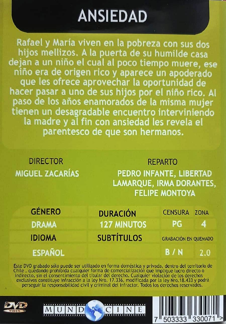 | Norma / Región: Multizona (Disco Quemado ) | Cantidad de Discos: 1 | Lanzamiento: 2010 | Género(s): Drama | Audio: Español | Título: Ansiedad (1953) | Director(es): Miguel Zacarías | Reparto: Pedro Infante, Libertad Lamarque, Irma Dorantes, Arturo Soto Rangel, Guillermo Samperio, Salvador Quiroz, José Muñoz