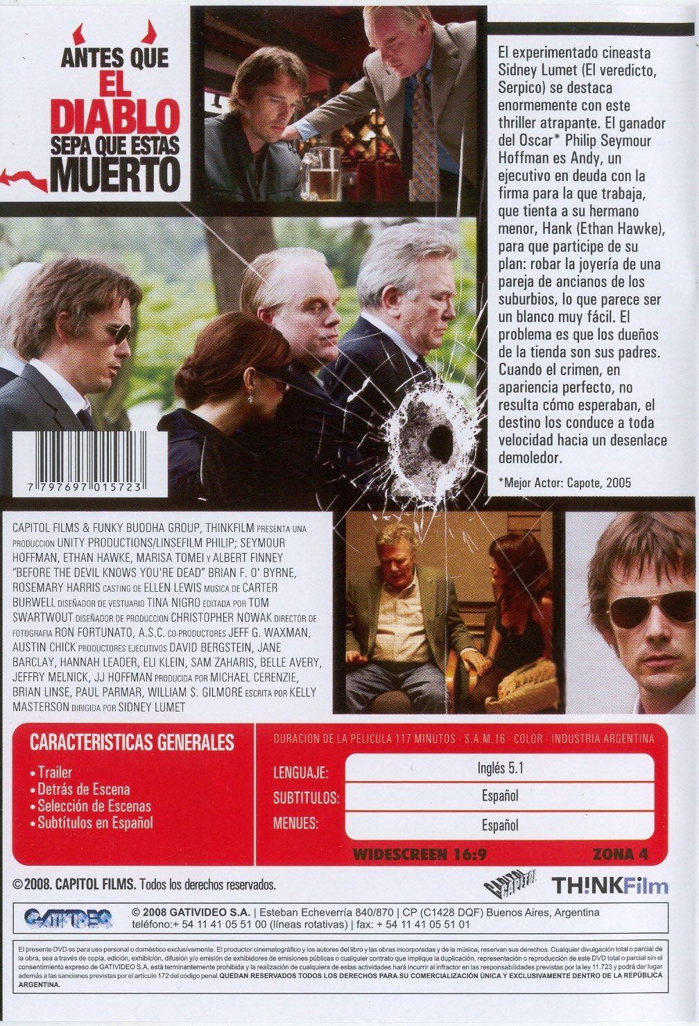 Cantidad de Discos: 1 | Lanzamiento: 2007 | Género(s): Thriller, Drama | Audio: Inglés (Dobly Digital 5,1) | SubtÃtulos: Español | TÃtulo: Before the Devil Knows You’re Dead | Director(es): Sidney Lumet | Reparto: Philip Seymour Hoffman, Ethan Hawke, Albert Finney, Marisa Tomei, Rosemary Harris, Aleksa Palladino, Michael Shannon, Amy Ryan, Brian F. O’Byrne, Lee Wilkof, Jordan Gelber, James Lally, Adrian Martinez | Norma / Región: NTSC (Región 1, 4) | Cantidad de Discos: 1 | Lanzamiento: 2007 | Género(s): Thriller, Drama | Audio: Inglés (Dobly Digital 5,1) | SubtÃtulos: Español | TÃtulo: Before the Devil Knows You’re Dead | Director(es): Sidney Lumet | Reparto: Philip Seymour Hoffman, Ethan Hawke, Albert Finney, Marisa Tomei, Rosemary Harris, Aleksa Palladino, Michael Shannon, Amy Ryan, Brian F. O’Byrne, Lee Wilkof, Jordan Gelber, James Lally, Adrian Martinez | Norma / Región: NTSC (Región 1, 4)