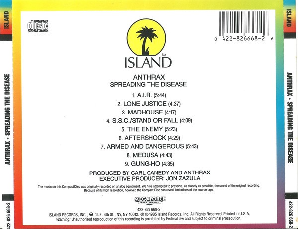 Artista(s) / Grupo: Anthrax | Cantidad de Discos: 1 | Lanzamiento: 1985 | Género(s): Rock. | Estilo(s): Heavy Metal, Speed Metal, Thrash. | TÃtulo: Spreading The Disease | Artista(s) / Grupo: Anthrax | Cantidad de Discos: 1 | Lanzamiento: 1985 | Género(s): Rock. | Estilo(s): Heavy Metal, Speed Metal, Thrash. | TÃtulo: Spreading The Disease