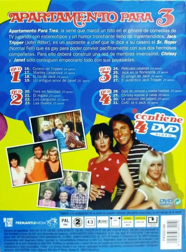 Cantidad de Discos: 4 | Lanzamiento: 2004 | Género(s): Serie de TV, Comedia | Audio: Español (Dobly Digital), Inglés (Dolby Digital) | SubtÃtulos: Español | TÃtulo: Tres son multitud – Vol 2 o Three’s Company (1977) | Director(es): Brian Cooke (Creator), Johnnie Mortimer (Creator), Dave Powers, Bill Hobin | Reparto: John Ritter, Joyce DeWitt, Suzanne Sommers, Norman Fell, Audra Lindley, Richard Kline, Don Knotts, Priscilla Barnes, Jenilee Harrison, Ann Wedgeworth | Norma / Región: PAL (Región 2) | Cantidad de Discos: 4 | Lanzamiento: 2004 | Género(s): Serie de TV, Comedia | Audio: Español (Dobly Digital), Inglés (Dolby Digital) | SubtÃtulos: Español | TÃtulo: Tres son multitud – Vol 2 o Three’s Company (1977) | Director(es): Brian Cooke (Creator), Johnnie Mortimer (Creator), Dave Powers, Bill Hobin | Reparto: John Ritter, Joyce DeWitt, Suzanne Sommers, Norman Fell, Audra Lindley, Richard Kline, Don Knotts, Priscilla Barnes, Jenilee Harrison, Ann Wedgeworth | Norma / Región: PAL (Región 2)