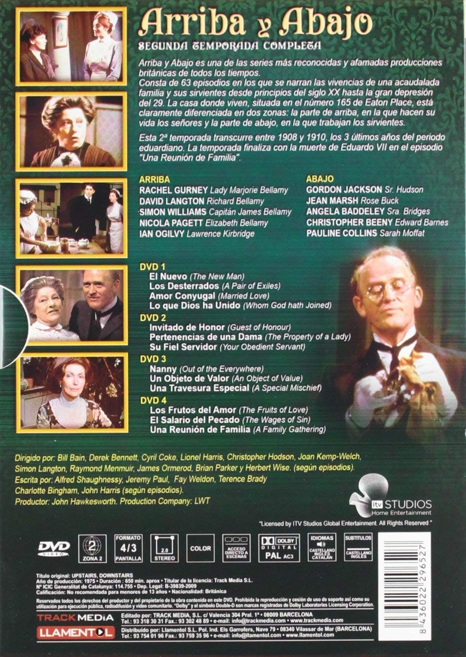 Cantidad de Discos: 4 | Lanzamiento: 2012 | Género(s): Serie de TV, Drama | Audio: Español, Inglés, Catalan | SubtÃtulos: Español, Inglés | TÃtulo: Upstairs, Downstairs – 2 Temporada (1971) | Director(es): Bill Bain, Christopher Hodson, Raymond Menmuir, Derek Bennett, Cyril Coke, Joan Kemp-Welch, Brian Parker, Simon Langton, Herbert Wise, Lionel Harris, James Ormerod | Reparto: Gordon Jackson, David Langton, Jean Marsh, Angela Baddeley, Christopher Beeny, Jenny Tomasin, Simon Williams, Jacqueline Tong, Lesley-Anne Down, Rachel Gurney, Meg Wynn Owen, Joan Benham, Raymond Huntley, Nicola Pagett, Pauline Collins, Hannah Gordon, Patsy Smart, Gareth Hunt, John Alderton, George Innes, Anthony Andrews, Cathleen Nesbitt, Richard Vernon, Keith Barron, Anthony Ainley, Donald Burton, Celia Imrie, Charles Gray, Susan Penhaligon, Robert Hardy, Jack Watson, Phyllida Law, Frank Middlemass, Nigel Havers, Georgia Brown | Norma / Región: PAL (Región 2) | Cantidad de Discos: 4 | Lanzamiento: 2012 | Género(s): Serie d