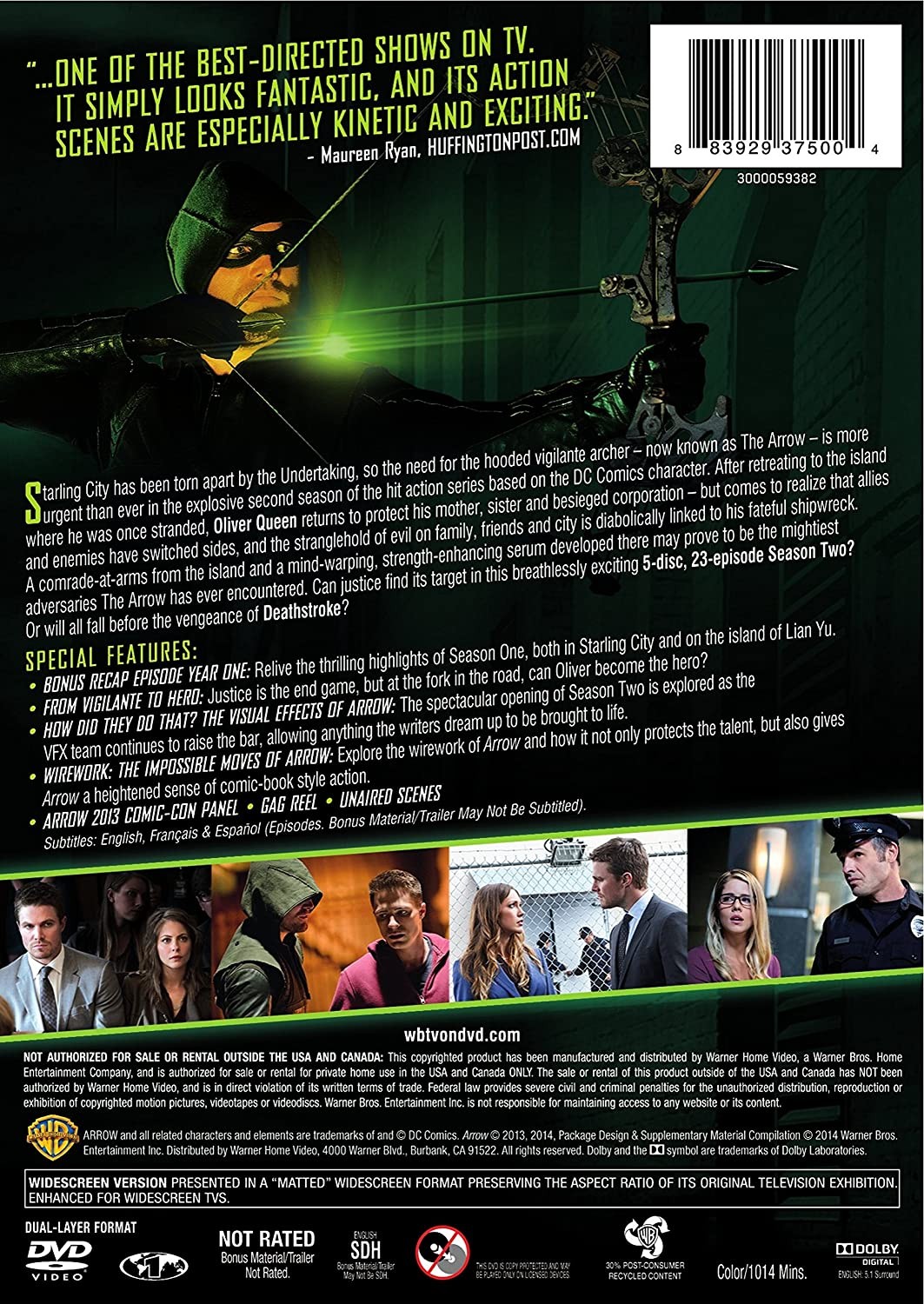 Cantidad de Discos: 5 DVD | Lanzamiento: 2014 | Género(s): Serie de TV. Aventuras. Acción | Audio: Español, Inglés, Francés | SubtÃtulos: Español, Inglés, Francés | TÃtulo: Arrow – Temporada 2 | Director(es): Greg Berlanti, Marc Guggenheim, Andrew Kreisberg | Reparto: Stephen Amell, Katie Cassidy, Colin Donnell, David Ramsey, Willa Holland, Susanna Thompson, Paul Blackthorne, Emily Bett Rickards, John Barrowman, Colin Salmon, Manu Bennett, Byron Mann, Sebastian Dunn, Roger R. Cross, Annie Ilonzeh, Celina Jade, Christie Laing, Colton Haynes, Kelly Hu, Jeffrey C. Robinson, Janina Gavankar, Chin Han, Jamey Sheridan, Jessica De Gouw, Alex Kingston, Eugene Lipinski, Seth Gabel, David Cubitt, Rila Fukushima, Dolph Lundgren, Carly Pope, Echo Kellum, Keri Adams, Caity Lotz | Norma / Región: NTSC (Región A) | Cantidad de Discos: 5 DVD | Lanzamiento: 2014 | Género(s): Serie de TV. Aventuras. Acción | Audio: Español, Inglés, Francés | SubtÃtulos: Español, Inglés, Francés | TÃtulo: Arrow – Tempora