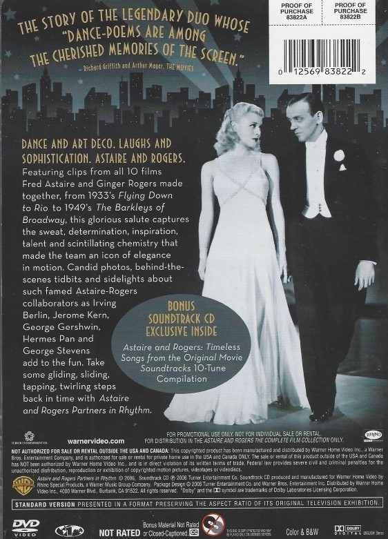 Cantidad de Discos: 1 DVD + 1 CD | Lanzamiento: 2006 | Género(s): Documental, Musical | Estilo(s): Soundtrack | Audio: Inglés (DHMA) | Título: Astaire and Rogers: Partners in Rhythm – The complete film collection | Director(es): Tara Tremaine | Reparto: Fred Astaire, Ava Astaire-McKenzie, Richard Barrios, Pandro S. Berman, Peter Bogdanovich | Norma / Región: NTSC 1 | Cantidad de Discos: 1 DVD + 1 CD | Lanzamiento: 2006 | Género(s): Documental, Musical | Estilo(s): Soundtrack | Audio: Inglés (DHMA) | Título: Astaire and Rogers: Partners in Rhythm – The complete film collection | Director(es): Tara Tremaine | Reparto: Fred Astaire, Ava Astaire-McKenzie, Richard Barrios, Pandro S. Berman, Peter Bogdanovich | Norma / Región: NTSC 1