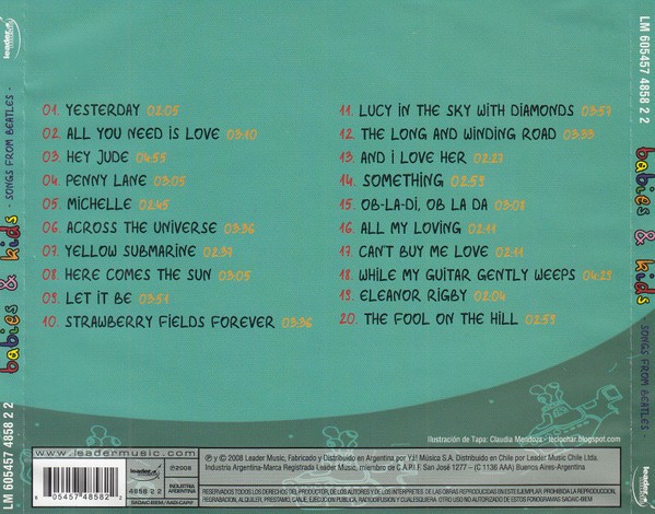 Artista(s) / Grupo: Babies & Kids | Cantidad de Discos: 1 | Lanzamiento: 2008 | Género(s): Children’s | TÃtulo: Songs From Beatles | Artista(s) / Grupo: Babies & Kids | Cantidad de Discos: 1 | Lanzamiento: 2008 | Género(s): Children’s | TÃtulo: Songs From Beatles | Artista(s) / Grupo: Babies & Kids | Cantidad de Discos: 1 | Lanzamiento: 2008 | Género(s): Children’s | TÃtulo: Songs From Beatles