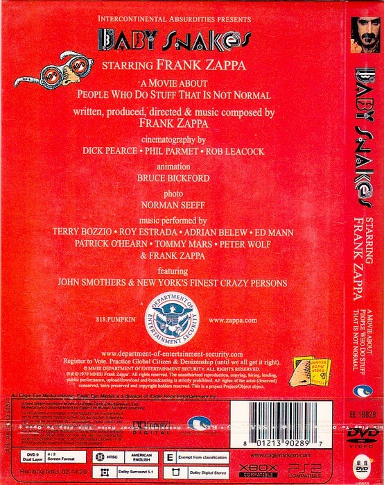 Artista(s) / Grupo: Frank Zappa | Cantidad de Discos: 1 DVD + Libro | Lanzamiento: 2003 | Género(s): Documental, Musical | Audio: Inglés (Dolby Digital 5,1) | TÃtulo: Baby Snakes (1979) | Director(es): Frank Zappa | Reparto: Frank Zappa, Adrian Belew, Terry Bozzio, Roy Estrada, Ed Mann, Patrick O´hearn, Peter Wolf, Tommy Mars | Norma / Región: NTSC 1 | Artista(s) / Grupo: Frank Zappa | Cantidad de Discos: 1 DVD + Libro | Lanzamiento: 2003 | Género(s): Documental, Musical | Audio: Inglés (Dolby Digital 5,1) | TÃtulo: Baby Snakes (1979) | Director(es): Frank Zappa | Reparto: Frank Zappa, Adrian Belew, Terry Bozzio, Roy Estrada, Ed Mann, Patrick O´hearn, Peter Wolf, Tommy Mars | Norma / Región: NTSC 1
