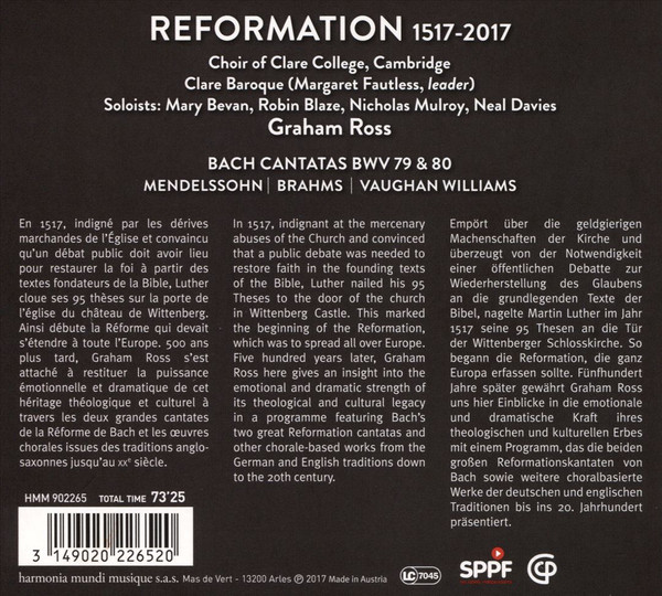 BACH / MENDELSSOHN / BRAHMS / VAUGHN WILLIAMS / CHOIR OF CLARE COLLEGE CAMRIDGE / GRAHAM ROSS – REFORMATION 1517-2017