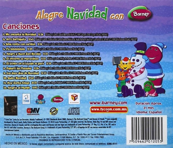 Artista(s) / Grupo: Barney | Cantidad de Discos: 1 | Lanzamiento: 2017 | Género(s): Pop | Estilo(s): Infantil | TÃtulo: Alegre Navidad con Barney | Artista(s) / Grupo: Barney | Cantidad de Discos: 1 | Lanzamiento: 2017 | Género(s): Pop | Estilo(s): Infantil | TÃtulo: Alegre Navidad con Barney