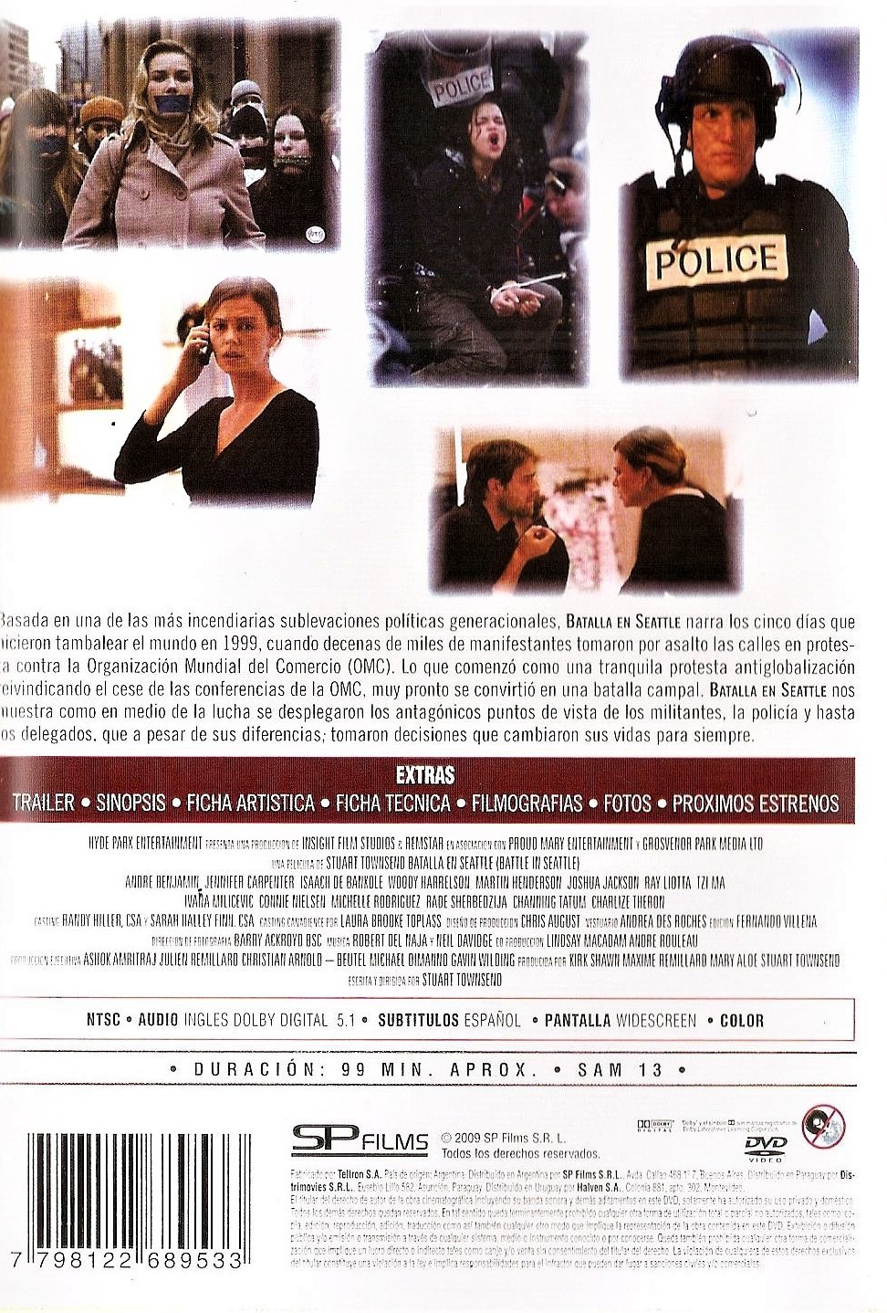 Cantidad de Discos: 1 DVD | Lanzamiento: 2007 | Género(s): Acción, Drama | Audio: Inglés (Dolby Digital 5.1) | SubtÃtulos: Español | TÃtulo: Battle in Seattle | Director(es): Stuart Townsend | Reparto: Charlize Theron, Woody Harrelson, Ray Liotta, Ivana Milicevic, Michelle Rodriguez, Connie Nielsen, Martin Henderson, Jennifer Carpenter, Isaach de Bankole, Tzi Ma, André Benjamin, Joshua Jackson, Rade Serbedzija, Channing Tatum, Gary Hudson