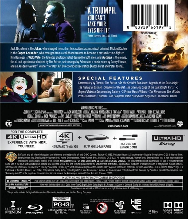 Cantidad de Discos: 1 4K + 1 BluRay | Lanzamiento: 2015 | Género(s): Acción, Thriller, Fantástico | Audio: Inglés (Dolby Digital 5,1), Español (Dolby Digital Stereo, Dolby Digital 5,1), Francés (Dolby Digital Stereo, Dolby Digital 5,1) | SubtÃtulos: Español, Inglés, Francés | TÃtulo: Batman (1989) | Director(es): Tim Burton | Reparto: Michael Keaton, Jack Nicholson, Kim Basinger, Robert Wuhl, Pat Hingle, Billy Dee Williams, Michael Gough, Jack Palance, Jerry Hall, Tracey Walter, Lee Wallace, William Hootkins, Philip Tan, Richard Strange, Carl Chase, Mac McDonald, George Lane Cooper, Terence Plummer, John Sterland, Edwin Craig, Vincent Wong, Joel Cutrara, John Dair, Christopher Fairbank, Kate Harper, Bruce McGuire, Richard Durden, Lachele Carl, Wayne Michaels, Valentino Musetti, Rocky Taylor, Keith Edwards, Leon Herbert, Steve Plytas, Amir M. Korangy, Hugo Blick, Philip O’Brien, Michael Balfour, Liza Ross, Garrick Hagon, David Baxt, Sam Douglas, Denis Lill, Paul Birchard | Norma / Región: NTSC (Reg