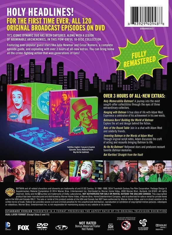 Reparto: Adam West, Burt Ward, Neil Hamilton, Alan Napier, Yvonne Craig, Cesar Romero, Burgess Meredith, Julie Newmar, Frank Gorshin, James O’Hara, William Dozier, Anne Baxter, Vincent Price, Victor Buono, Stafford Repp, Madge Blake, Byron Keith, David Lewis, Eartha Kitt, Carolyn Jones, Cliff Robertson, James Brolin, Milton Berle, Van Williams, Bruce Lee