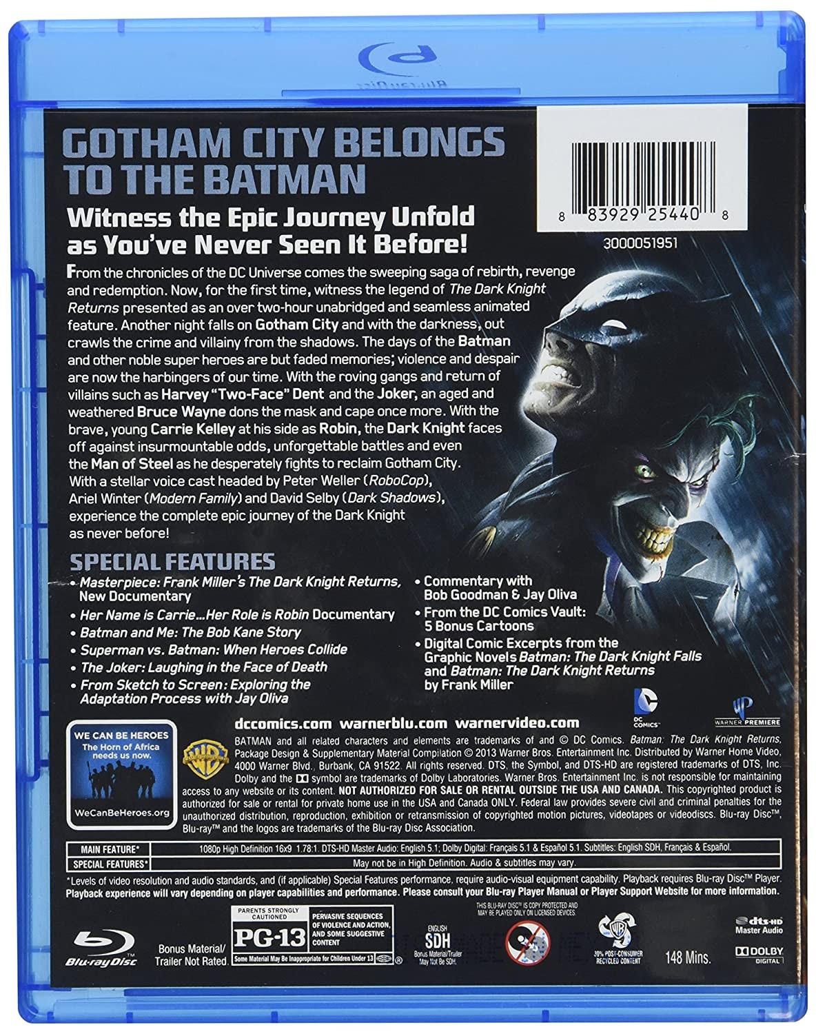 Cantidad de Discos: 1 BluRay + 1 DVD | Lanzamiento: 2012 | Género(s): Animación. Thriller. Acción | Audio: Español (Dolby Digital 5,1), Inglés (Dolby Digital 5,1) | SubtÃtulos: Español, Francés | TÃtulo: Batman – El regreso del caballero oscuro, parte 1 | Director(es): Jay Oliva | Reparto: Animación | Norma / Región: NTSC (Región A) | Series: DC Comics | Cantidad de Discos: 1 BluRay + 1 DVD | Lanzamiento: 2012 | Género(s): Animación. Thriller. Acción | Audio: Español (Dolby Digital 5,1), Inglés (Dolby Digital 5,1) | SubtÃtulos: Español, Francés | TÃtulo: Batman – El regreso del caballero oscuro, parte 1 | Director(es): Jay Oliva | Reparto: Animación | Norma / Región: NTSC (Región A) | Series: DC Comics