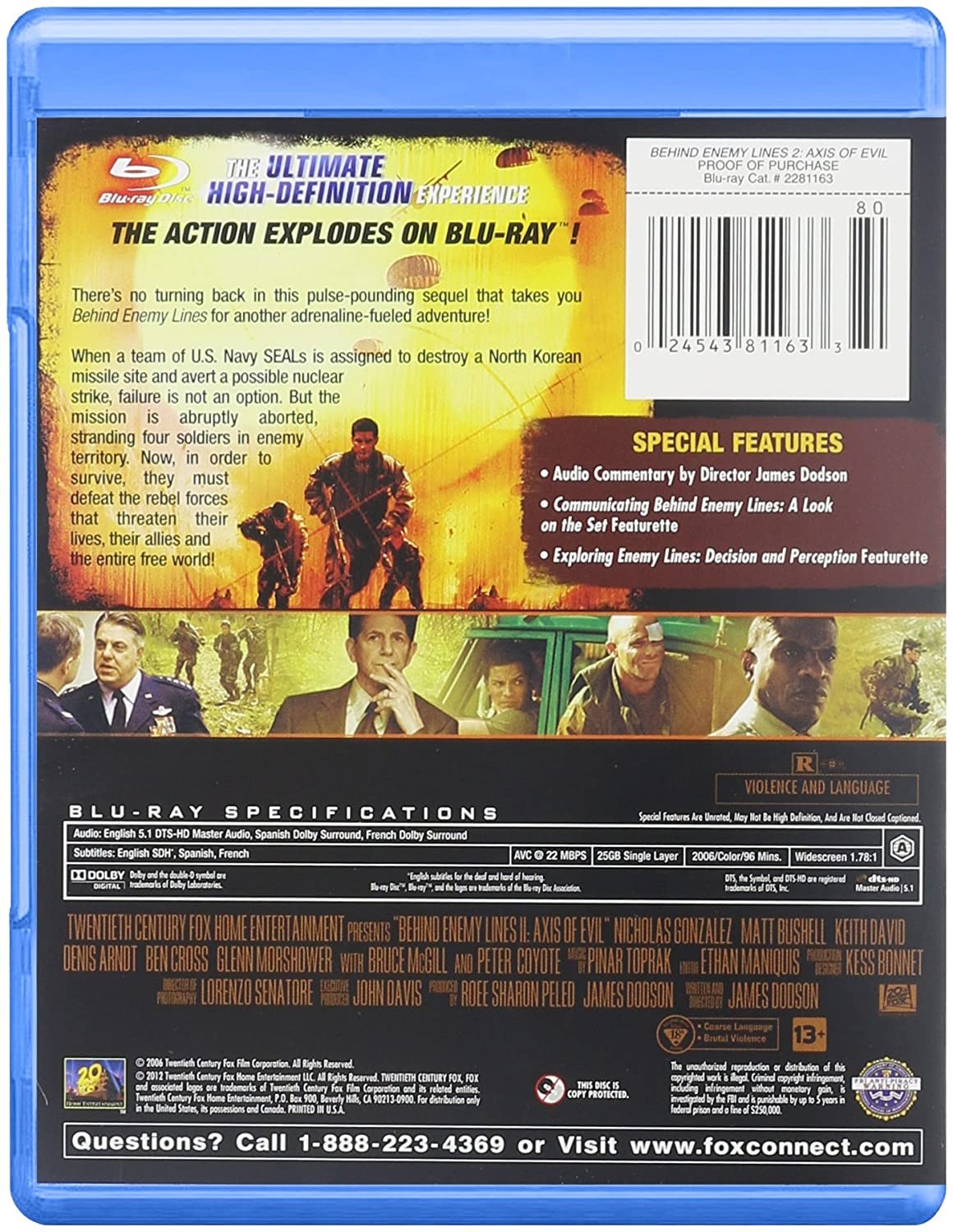 Cantidad de Discos: 1 | Lanzamiento: 2006 | Género(s): Bélico, Drama | Audio: Inglés, Francés, Español | SubtÃtulos: Inglés, Francés, Español | TÃtulo: Tras las lÃneas enemigas II – El eje del mal | Director(es): James Dodson | Reparto: Nicholas Gonzalez, Peter Coyote, Keith David, Matt Bushell, Ben Cross, Bruce McGill, Shane Edelman, Joseph Steven Yang, April Grace | Norma / Región: NTSC (Región A) | Cantidad de Discos: 1 | Lanzamiento: 2006 | Género(s): Bélico, Drama | Audio: Inglés, Francés, Español | SubtÃtulos: Inglés, Francés, Español | TÃtulo: Tras las lÃneas enemigas II – El eje del mal | Director(es): James Dodson | Reparto: Nicholas Gonzalez, Peter Coyote, Keith David, Matt Bushell, Ben Cross, Bruce McGill, Shane Edelman, Joseph Steven Yang, April Grace | Norma / Región: NTSC (Región A)