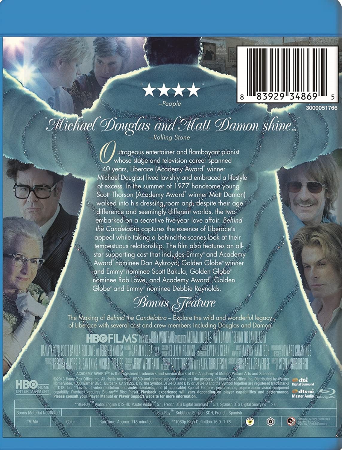 Cantidad de Discos: 1 | Lanzamiento: 2013 | Género(s): Drama | Audio: Inglés, Español, Francés | SubtÃtulos: Español, Inglés, Francés | TÃtulo: Behind The Candelabra | Director(es): Steven Soderbergh | Reparto: Michael Douglas, Matt Damon, Dan Aykroyd, Debbie Reynolds, Scott Bakula, Rob Lowe, Cheyenne Jackson, Boyd Holbrook, Nicky Katt, Tom Papa | Norma / Región: NTSC (Región A) | Cantidad de Discos: 1 | Lanzamiento: 2013 | Género(s): Drama | Audio: Inglés, Español, Francés | SubtÃtulos: Español, Inglés, Francés | TÃtulo: Behind The Candelabra | Director(es): Steven Soderbergh | Reparto: Michael Douglas, Matt Damon, Dan Aykroyd, Debbie Reynolds, Scott Bakula, Rob Lowe, Cheyenne Jackson, Boyd Holbrook, Nicky Katt, Tom Papa | Norma / Región: NTSC (Región A)