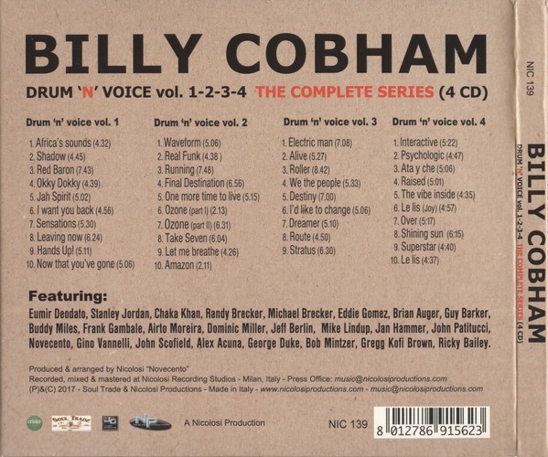 Artista(s) / Grupo: Billy Cobham | Cantidad de Discos: 4 | Lanzamiento: 2017 | Género(s): Jazz, Funk / Soul | Estilo(s): Jazz-Funk, Jazz-Rock, Fusion | Título: Drum ‘N’ Voice Vol.1-2-3-4 The Complete Series | Artista(s) / Grupo: Billy Cobham | Cantidad de Discos: 4 | Lanzamiento: 2017 | Género(s): Jazz, Funk / Soul | Estilo(s): Jazz-Funk, Jazz-Rock, Fusion | Título: Drum ‘N’ Voice Vol.1-2-3-4 The Complete Series