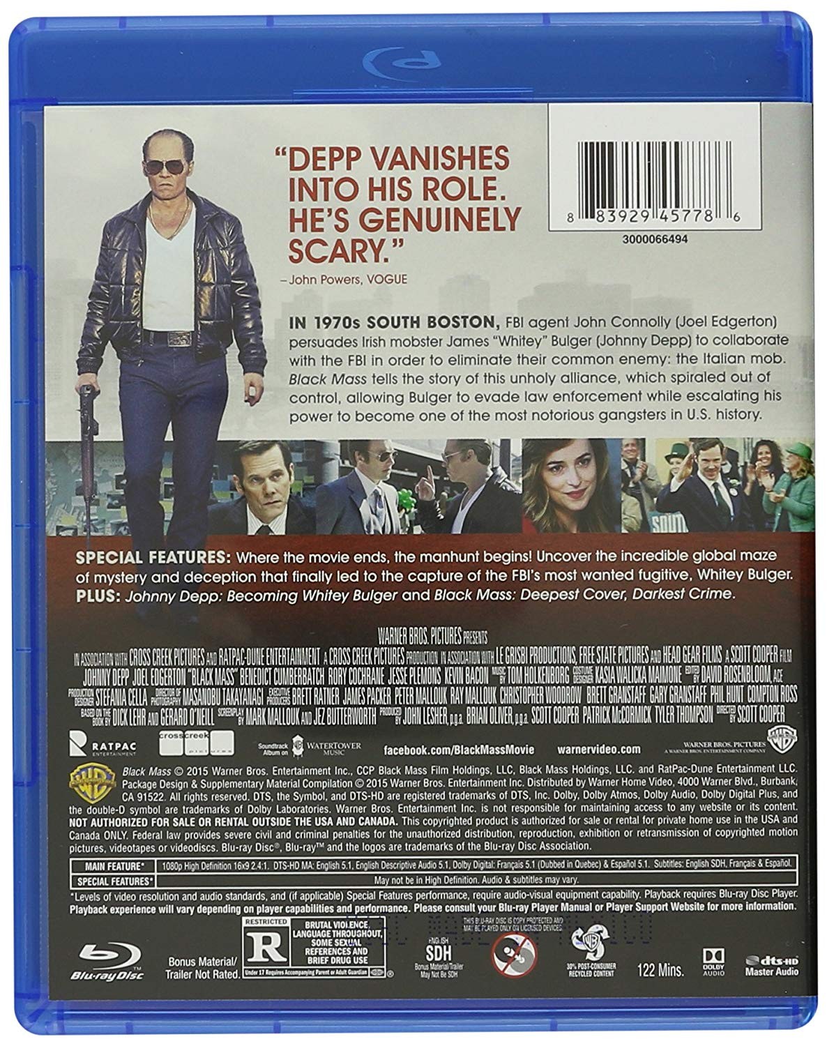 Cantidad de Discos: 1 | Lanzamiento: 2015 | Género(s): Thriller, Drama | Audio: Inglés (Dolby Digital 5,1), Español (Dolby Digital Stereo, Dolby Digital 5,1), Francés (Dolby Digital Stereo, Dolby Digital 5,1) | SubtÃtulos: Español, Inglés, Francés | TÃtulo: Pacto criminal | Director(es): Scott Cooper | Reparto: Johnny Depp, Joel Edgerton, Benedict Cumberbatch, Rory Cochrane, Jesse Plemons, Dakota Johnson, Kevin Bacon, Peter Sarsgaard, Corey Stoll, Juno Temple, Julianne Nicholson, Adam Scott, David Harbour, Jeremy Strong, W. Earl Brown, Brad Carter, Bill Camp, Mark Mahoney, Scott G. Anderson, Lonnie Farmer, Erica McDermott, Owen Burke, Lewis D. Wheeler, Robert Walsh, Jamie Donnelly, David De Beck, David Conley, Bates Wilder, Thomas Philip O’Neill, Anthony Molinari, Todd Ryan Jones, Declan Mulvey, Richard Donelly, Gary Galone, Brian A. White, Tom Kemp, Patrick M. Walsh, Naheem Garcia, Jack Neary, Jimmy Joe Maher, Danny DeMiller, Michael F. Murphy, Alexander Cook | Norma / Región: NTSC (Región A) | Ca