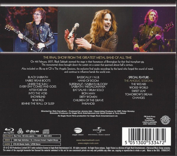 Artista(s) / Grupo: Black Sabbath | Cantidad de Discos: 1 BluRay + 1 CD | Lanzamiento: 2017 | Género(s): Rock | Estilo(s): Heavy Metal | TÃtulo: The End (4 February 2017 – Birmingham) | Norma / Región: Multizona | Artista(s) / Grupo: Black Sabbath | Cantidad de Discos: 1 BluRay + 1 CD | Lanzamiento: 2017 | Género(s): Rock | Estilo(s): Heavy Metal | TÃtulo: The End (4 February 2017 – Birmingham) | Norma / Región: Multizona