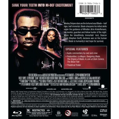 Cantidad de Discos: 1 | Lanzamiento: 1998 | Género(s): Acción, Thriller, Fantástico | Audio: Inglés, Español, Portugués, Italiano | SubtÃtulos: Inglés, Español y más | TÃtulo: Blade | Director(es): Stephen Norrington | Reparto: Wesley Snipes, Stephen Dorff, Kris Kristofferson, Sanaa Lathan, Donal Logue, Traci Lords, Udo Kier, N’Bushe Wright, Arly Jover | Norma / Región: NTSC (Región A) | Cantidad de Discos: 1 | Lanzamiento: 1998 | Género(s): Acción, Thriller, Fantástico | Audio: Inglés, Español, Portugués, Italiano | SubtÃtulos: Inglés, Español y más | TÃtulo: Blade | Director(es): Stephen Norrington | Reparto: Wesley Snipes, Stephen Dorff, Kris Kristofferson, Sanaa Lathan, Donal Logue, Traci Lords, Udo Kier, N’Bushe Wright, Arly Jover | Norma / Región: NTSC (Región A)