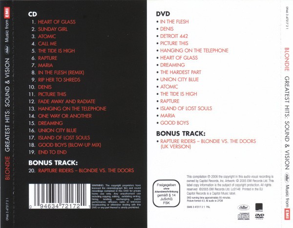Artista(s) / Grupo: Blondie | Cantidad de Discos: 1 DVD + 1 CD | Género(s): Rock, Pop | Estilo(s): New Wave, Pop Rock, Synth-pop, Disco, Reggae-Pop | Título: Greatest Hits: Sound & Vision | Artista(s) / Grupo: Blondie | Cantidad de Discos: 1 DVD + 1 CD | Género(s): Rock, Pop | Estilo(s): New Wave, Pop Rock, Synth-pop, Disco, Reggae-Pop | Título: Greatest Hits: Sound & Vision