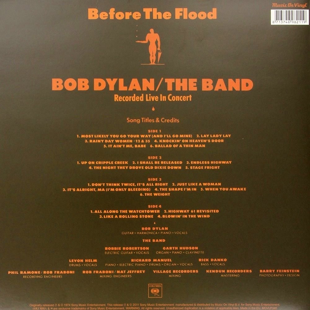 Artista(s) / Grupo: Bob Dylan / The Band | Cantidad de Discos: 2 LP | Lanzamiento: 2011 | Género(s): Folk Rock | Estilo(s): Blues Rock, Folk Rock, Classic Rock | TÃtulo: Before The Flood | Artista(s) / Grupo: Bob Dylan / The Band | Cantidad de Discos: 2 LP | Lanzamiento: 2011 | Género(s): Folk Rock | Estilo(s): Blues Rock, Folk Rock, Classic Rock | TÃtulo: Before The Flood