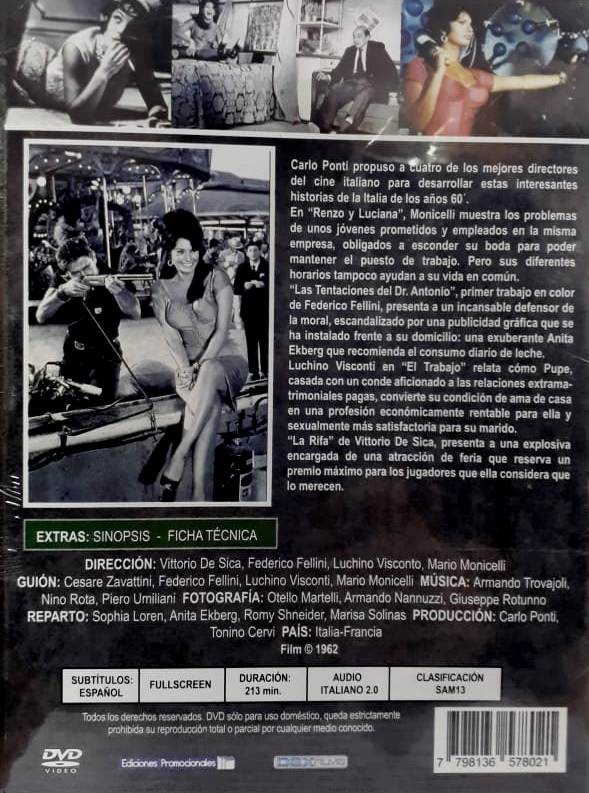 Comedia satírica en la que cuatro grandes directores italianos hacen una adaptación cinematográfica de algunos cuentos de Boccaccio. En «Renzo y Luciana», Monicelli narra la historia de un hombre y una mujer que se ven obligados a casarse en secreto para no perder su trabajo. En «Le tentazioni del dottor Antonio», dirigida por Fellini, un hombre se siente muy escandalizado por un cartel publicitario. En «Il lavoro» Visconti cuenta la historia de un conde involucrado en un escándalo. De Sica relata una historia ambientada en Nápoles: «La riffa».
