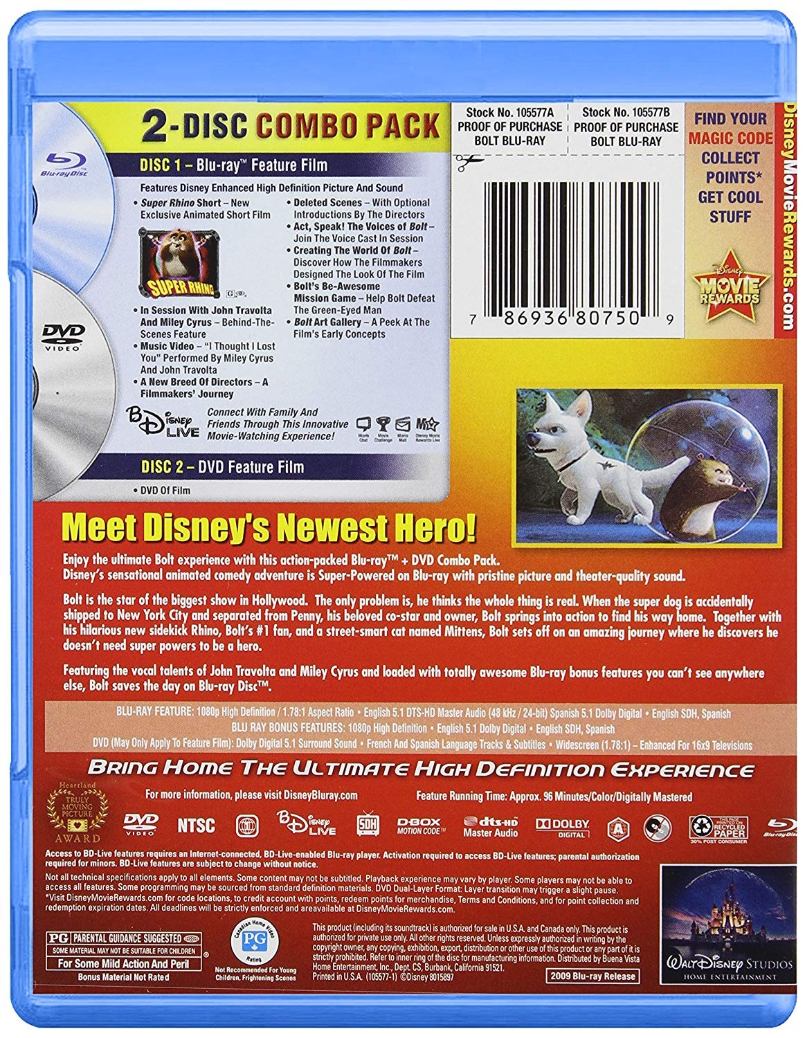 Cantidad de Discos: BLR + DVD | Lanzamiento: 2008 | Género(s): Animación | Audio: Español, Inglés, Francés | SubtÃtulos: Español, Inglés | TÃtulo: Bolt – Un perro fuera de serie | Director(es): Chris Williams, Byron Howard | Reparto: John Travolta, Miley Cyrus, Susie Essman, Mark Walton, Malcolm McDowell | Sub-CategorÃas: Animación | Norma / Región: NTSC (Región 1, 4) | Cantidad de Discos: BLR + DVD | Lanzamiento: 2008 | Género(s): Animación | Audio: Español, Inglés, Francés | SubtÃtulos: Español, Inglés | TÃtulo: Bolt – Un perro fuera de serie | Director(es): Chris Williams, Byron Howard | Reparto: John Travolta, Miley Cyrus, Susie Essman, Mark Walton, Malcolm McDowell | Sub-CategorÃas: Animación | Norma / Región: NTSC (Región 1, 4)