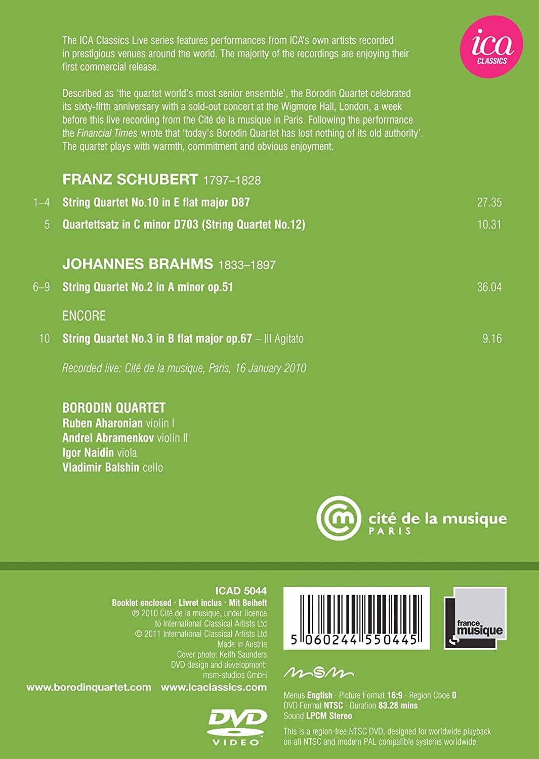 Artista(s) / Grupo: Borodin Quartet / Schubert | Cantidad de Discos: 1 | Lanzamiento: 2011 | Género(s): Classical | Audio: Inglés (DHMA) | Título: Sinfonías Nos10 & 12 / Brahms N° 2 – Live | Reparto: Andrei Abramenkov, Borodin Quartet, Igor Naidin, Patrick Creery, Ruben Aharonian | Norma / Región: Multizona | Artista(s) / Grupo: Borodin Quartet / Schubert | Cantidad de Discos: 1 | Lanzamiento: 2011 | Género(s): Classical | Audio: Inglés (DHMA) | Título: Sinfonías Nos10 & 12 / Brahms N° 2 – Live | Reparto: Andrei Abramenkov, Borodin Quartet, Igor Naidin, Patrick Creery, Ruben Aharonian | Norma / Región: Multizona