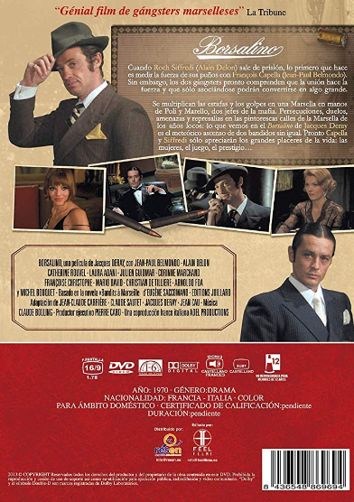 Cantidad de Discos: 1 | Lanzamiento: 1970 | Género(s): Intriga | Audio: Español, Francés | SubtÃtulos: Español | TÃtulo: Borsalino | Director(es): Jacques Deray | Reparto: Alain Delon, Jean-Paul Belmondo, Michel Bouquet, Catherine Rouvel, Corinne Marchand, Françoise Christophe, Julien Guiomar, Mireille Darc | Norma / Región: Multizona | Cantidad de Discos: 1 | Lanzamiento: 1970 | Género(s): Intriga | Audio: Español, Francés | SubtÃtulos: Español | TÃtulo: Borsalino | Director(es): Jacques Deray | Reparto: Alain Delon, Jean-Paul Belmondo, Michel Bouquet, Catherine Rouvel, Corinne Marchand, Françoise Christophe, Julien Guiomar, Mireille Darc | Norma / Región: Multizona