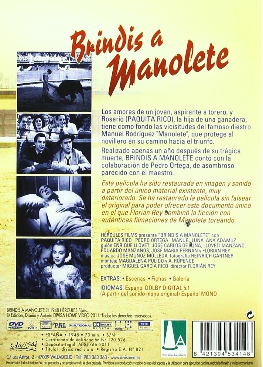 Cantidad de Discos: 1 | Lanzamiento: 1948 | Género(s): Drama | Audio: Inglés, Español | SubtÃtulos: Español, Inglés | TÃtulo: Brindis a Manolete | Director(es): Florián Rey | Reparto: Paquita Rico, Pedro Ortega, Manolo Morán, José Greco, Ana Adamuz, Eulália del Pino, Domingo Rivas, Juana Mansó, Manolo Badajoz, Mercedes Castellanos, Manuel Monroy | Norma / Región: PAL (Región 2) | Cantidad de Discos: 1 | Lanzamiento: 1948 | Género(s): Drama | Audio: Inglés, Español | SubtÃtulos: Español, Inglés | TÃtulo: Brindis a Manolete | Director(es): Florián Rey | Reparto: Paquita Rico, Pedro Ortega, Manolo Morán, José Greco, Ana Adamuz, Eulália del Pino, Domingo Rivas, Juana Mansó, Manolo Badajoz, Mercedes Castellanos, Manuel Monroy | Norma / Región: PAL (Región 2)