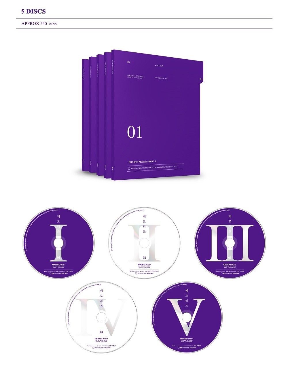 Artista(s) / Grupo: BTS | Cantidad de Discos: 5 BluRay + Libro | Lanzamiento: 2017 | Género(s): K-Pop | Estilo(s): K-pop, Hip hop, R&B contemporáneo, Dance | Título: Memories Of 2017 | Artista(s) / Grupo: BTS | Cantidad de Discos: 5 BluRay + Libro | Lanzamiento: 2017 | Género(s): K-Pop | Estilo(s): K-pop, Hip hop, R&B contemporáneo, Dance | Título: Memories Of 2017