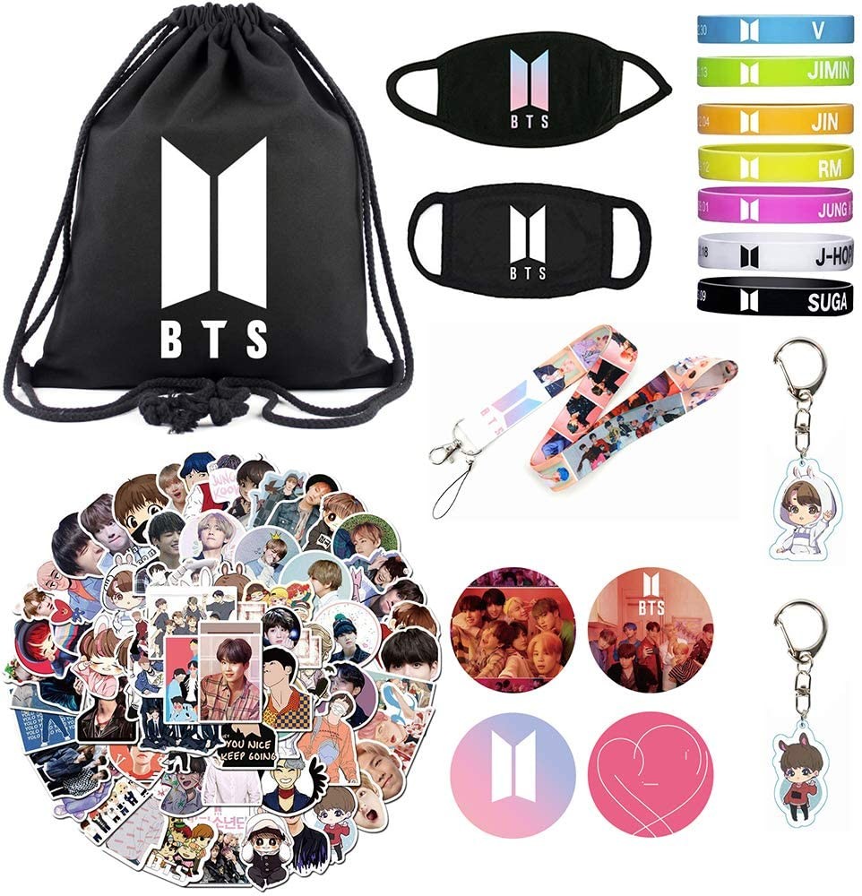 - Juego de regalo BTS: incluye 1 bolsa con cordón, 77 pegatinas BTS, 1 cordón, 6.6 ft-asks, 2 llaveros, 7 pulseras, 4 pines de botón